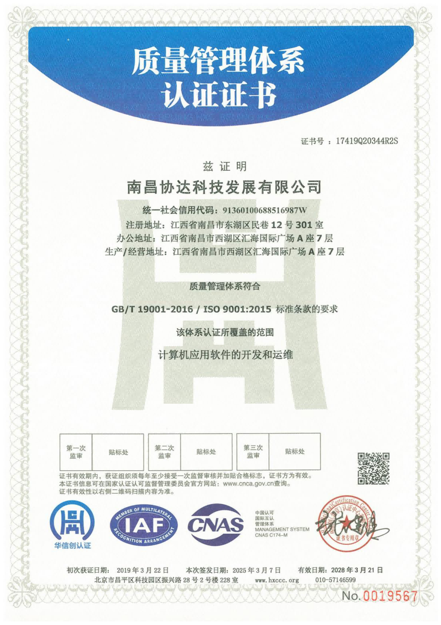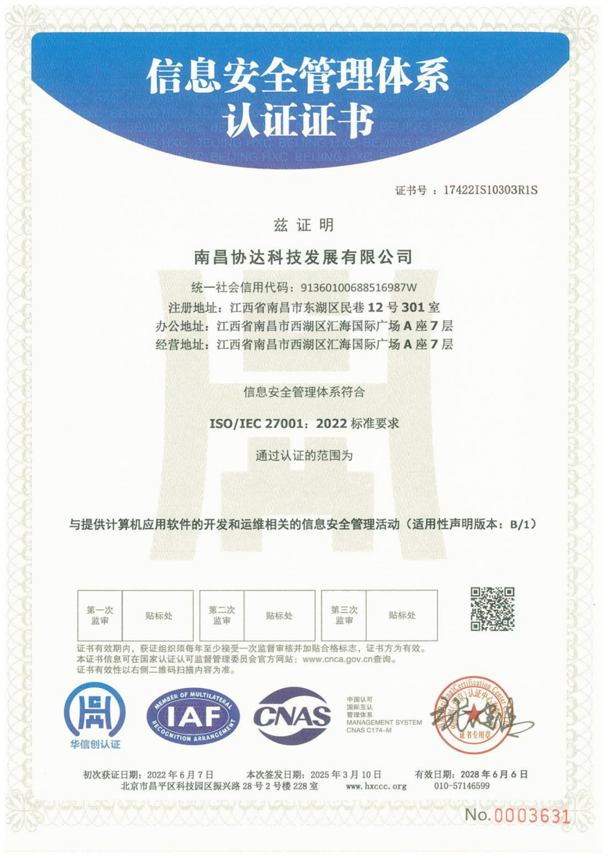 協達科技成立于2009年5月,憑借高端的軟件研發技術及先進的管理理念順利通過保密資質、國家高新技術企業資質認定及江西省“專精特新”中小企業資質認定,先后獲得CMMI3級證書、ITSS運維服務、CCRC軟件安全開發、ISO27017、ISO27001及三體系認證證書等。