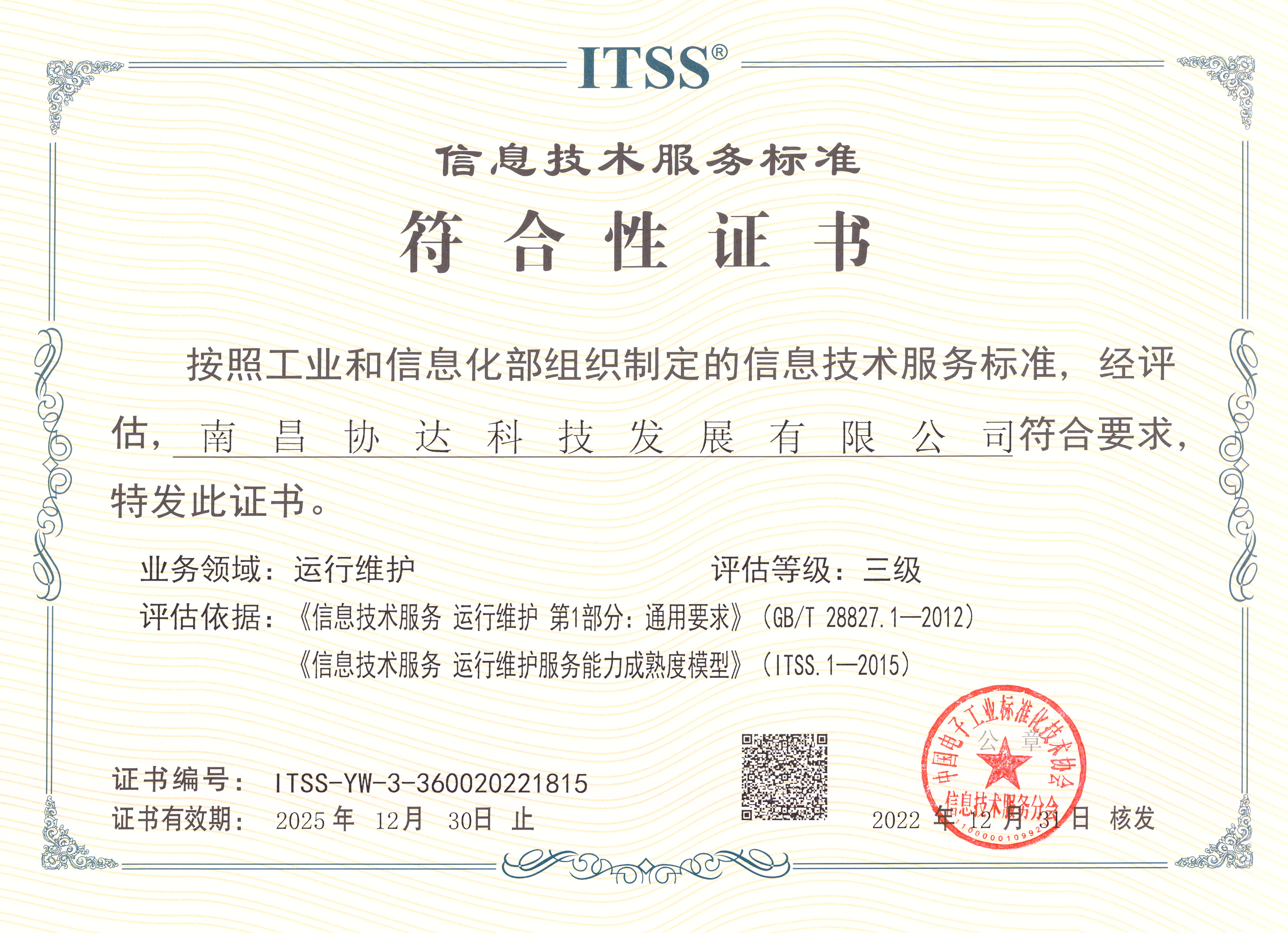 近日,南昌協(xié)達(dá)科技發(fā)展有限公司順利通過(guò)ITSS信息技術(shù)服務(wù)標(biāo)準(zhǔn)符合性評(píng)估三級(jí)認(rèn)證,獲得“ITSS信息技術(shù)服務(wù)標(biāo)準(zhǔn)符合性證書”。