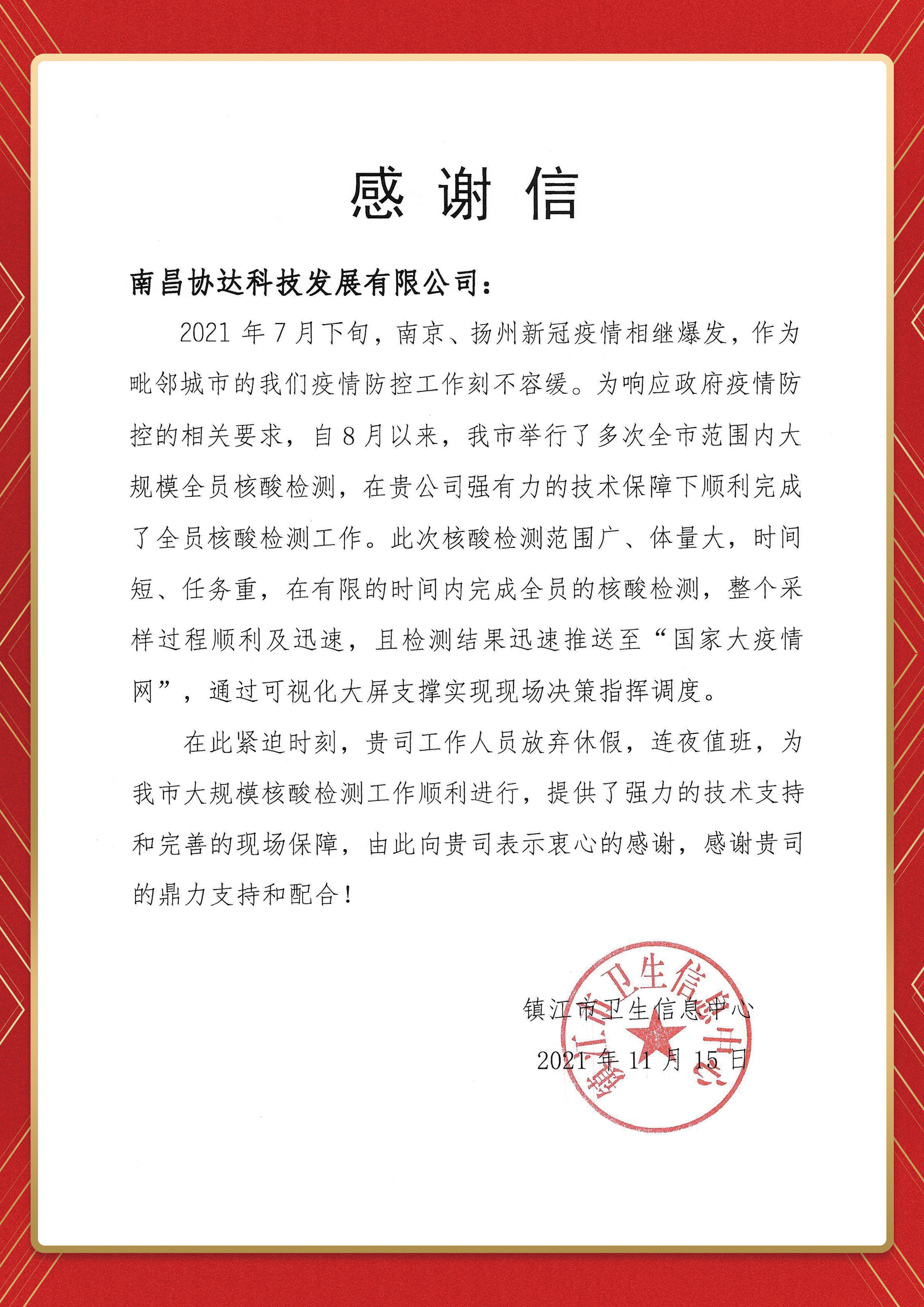 近日,我公司收到一封來自鎮江市衛生健康委衛生信息中心的感謝信,自新冠疫情爆發起來,我公司多次收到感謝信,除了對我公司的信任之外,更多的是一份承諾和責任,協達科技始終把社會責任擺在第一位,始終秉持“匠心”專注一個行業、一件事,不辜負行業,不辜負未來。